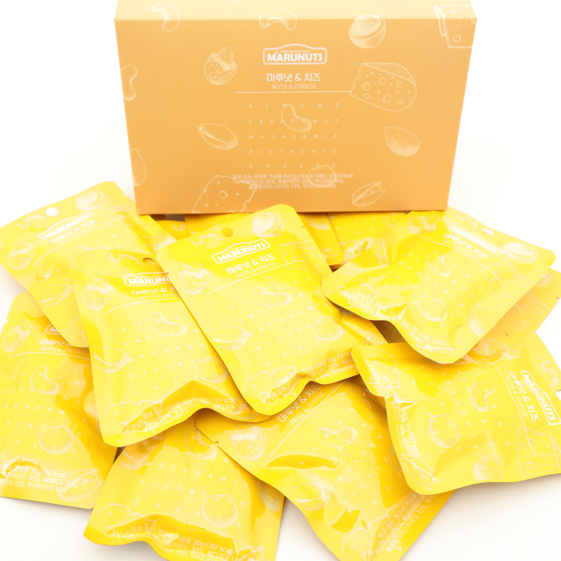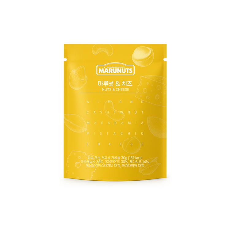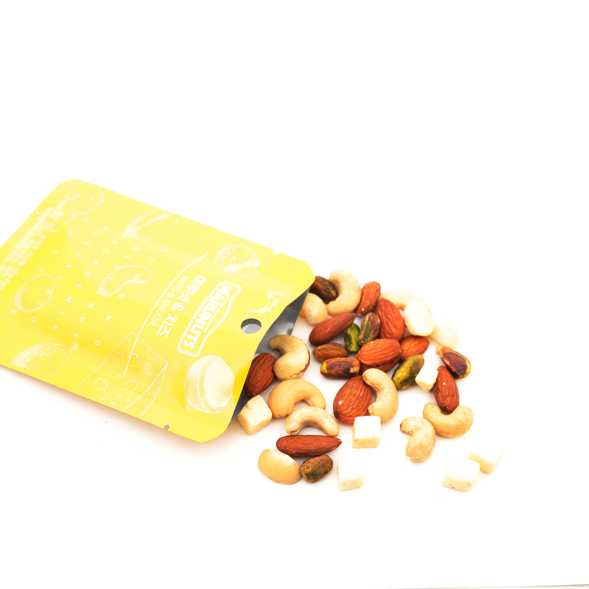 구운 아몬드 30%, 구운캐슈넛 30%, 건조체다치즈14% 구운탈각피스타치오13%, 마카다미아13%